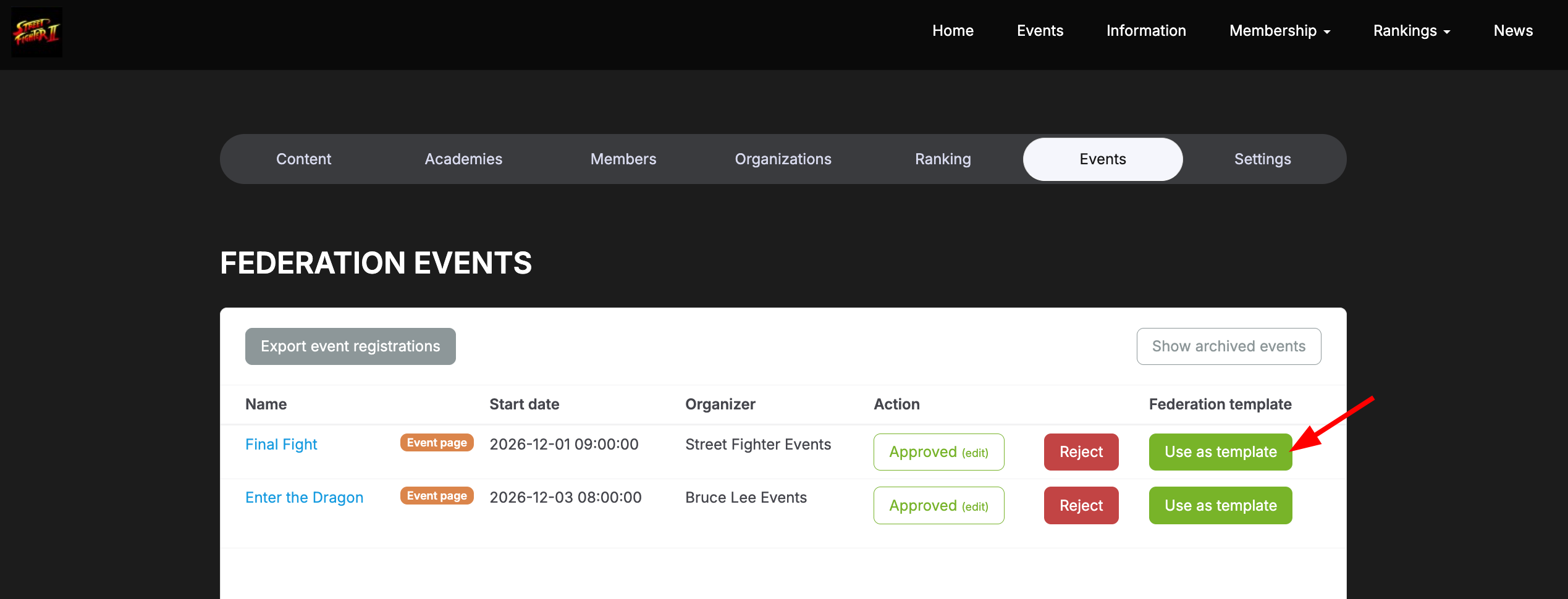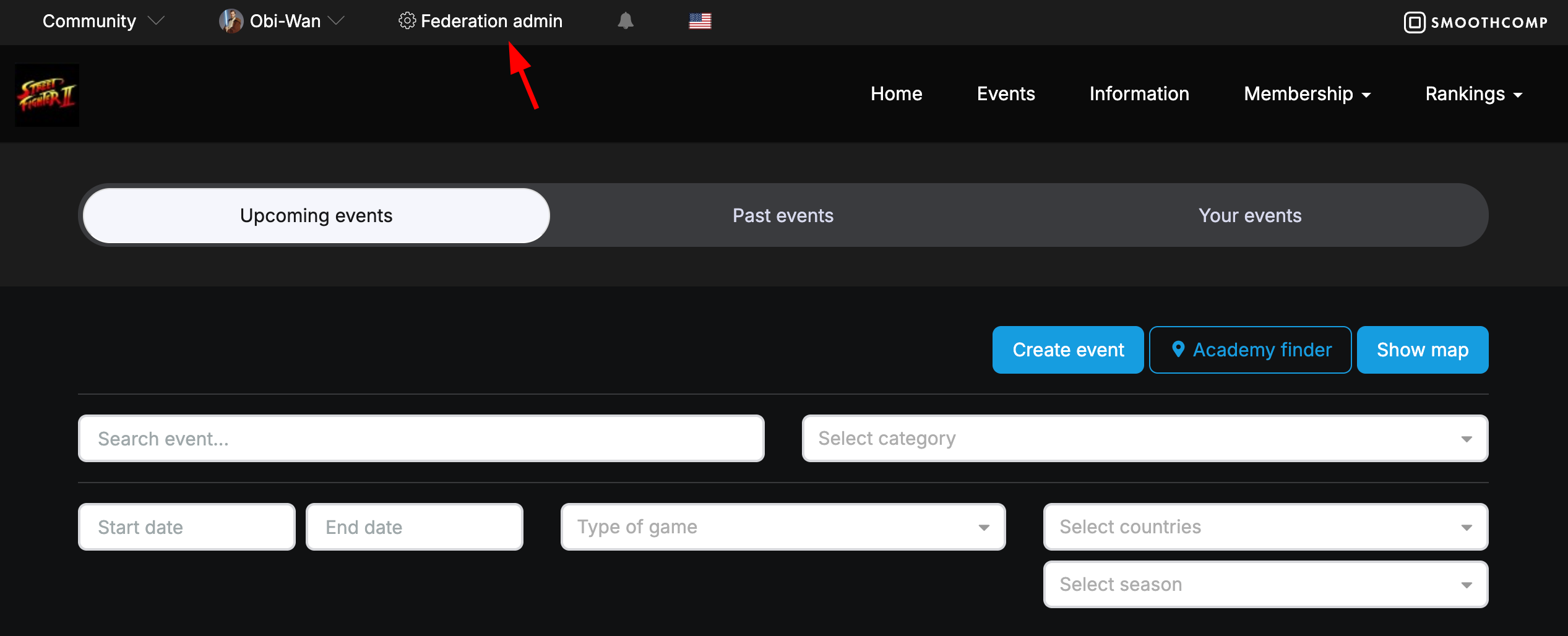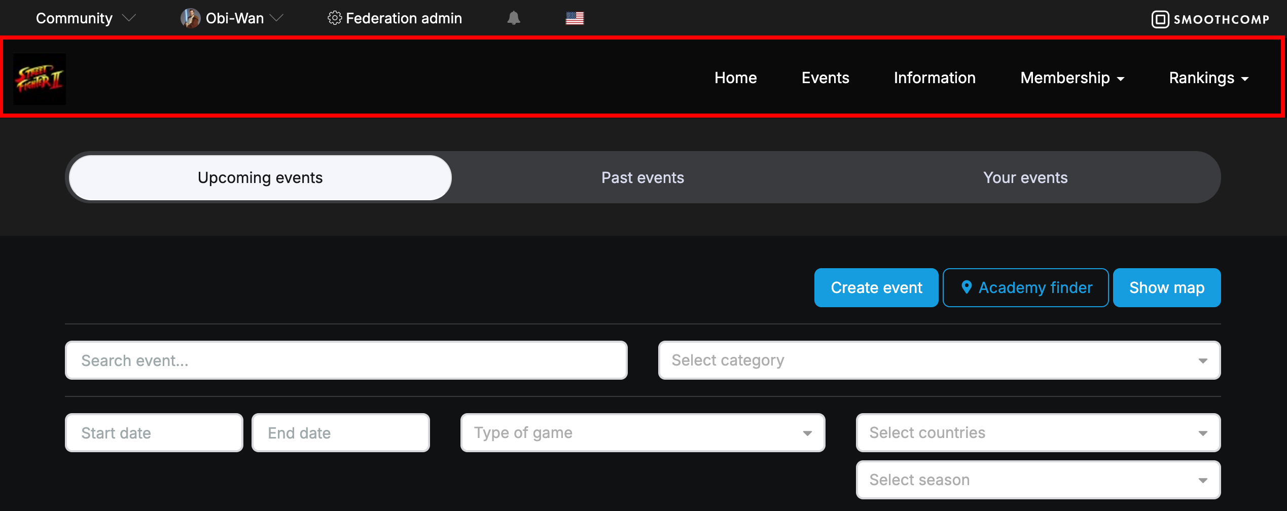 Events ⇒ Page for Upcoming events, Past events and Your events (Events run by the federation that the one who visits the page are registered to).