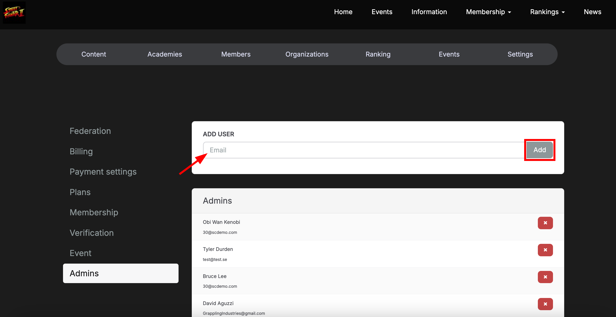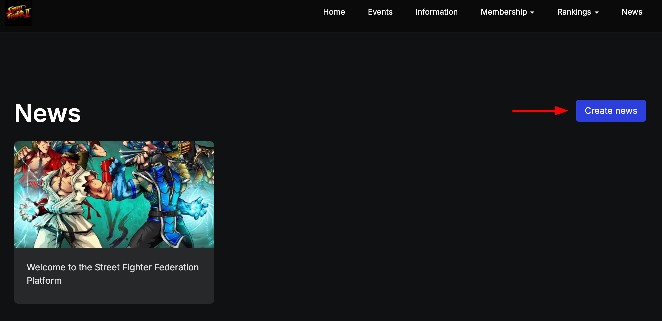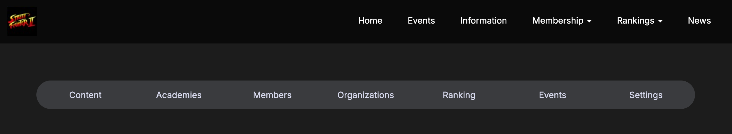 Events ⇒ Page for Upcoming events, Past events and Your events (Events run by the federation that the one who visits the page are registered to).