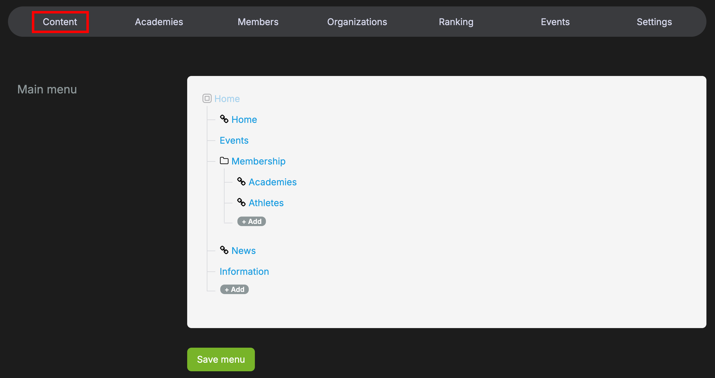 This is your CMS tool and is available in the premium plan. CMS stands for Content Management System and from here you can build the menu for your federation pages.