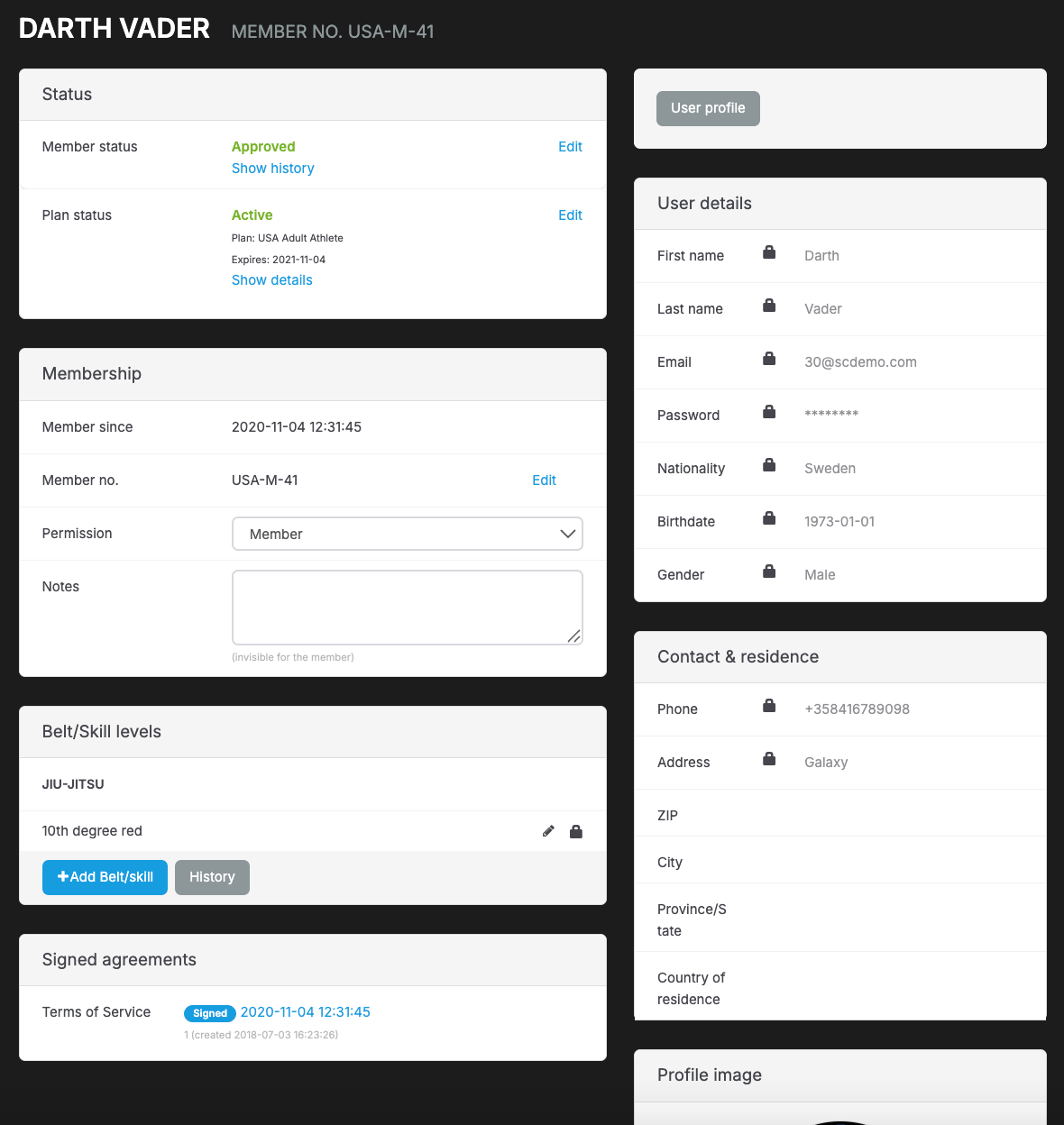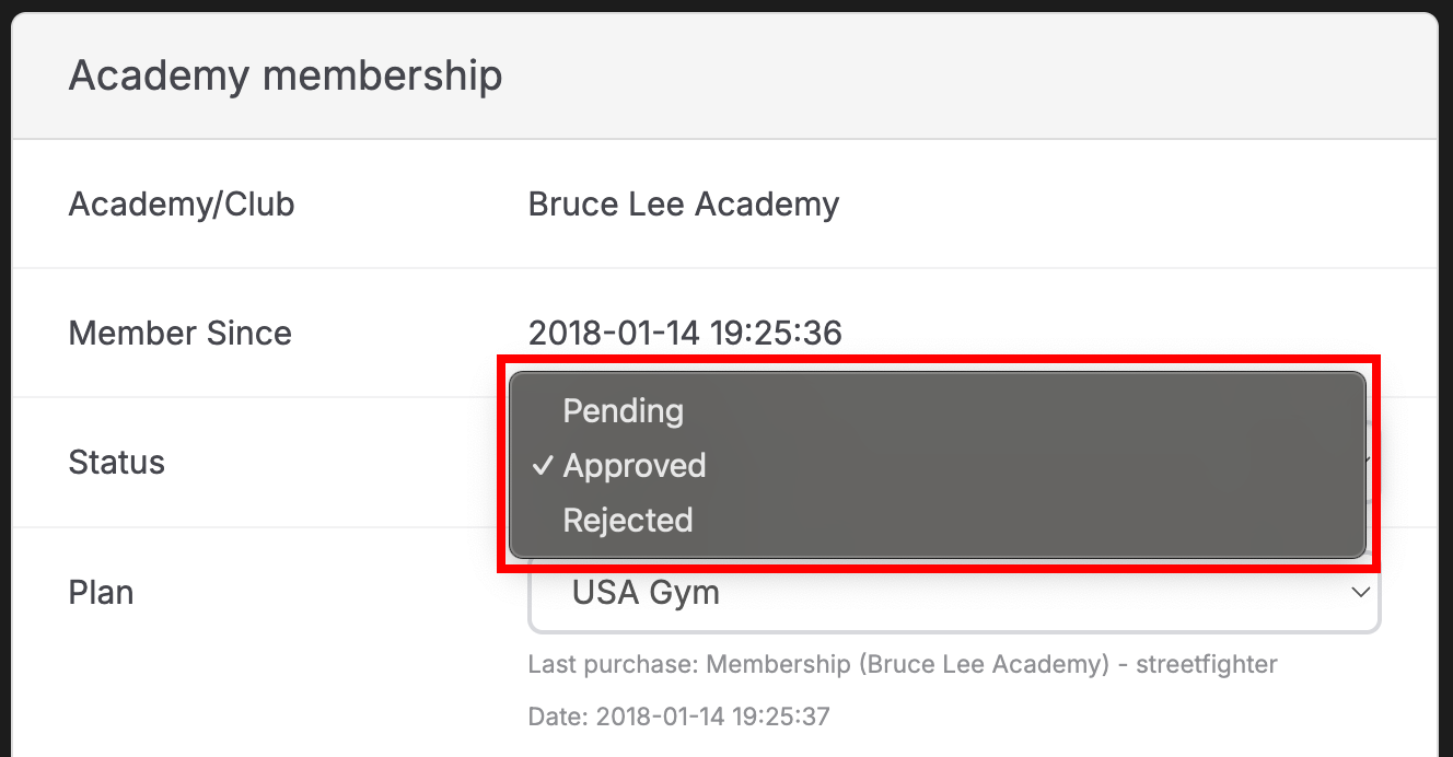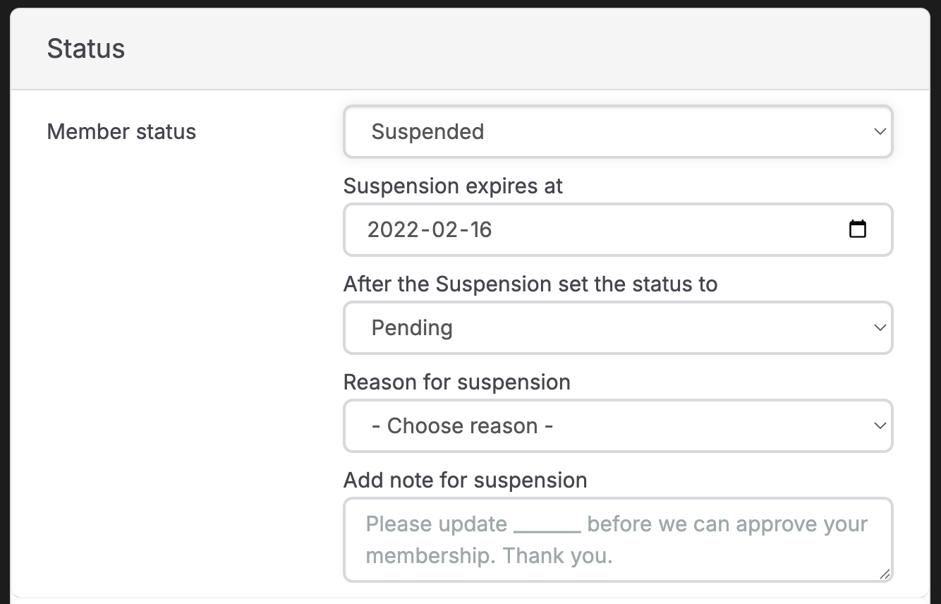 You can set their status to Pending, Approved or Rejected, just like with the academy, but with individual athletes you also have the option to set them to Suspended. The suspension can be set to a certain date and if the plan should be active or pending when the suspension is over. The reasons for suspension are set up by you in the Membership status settings.