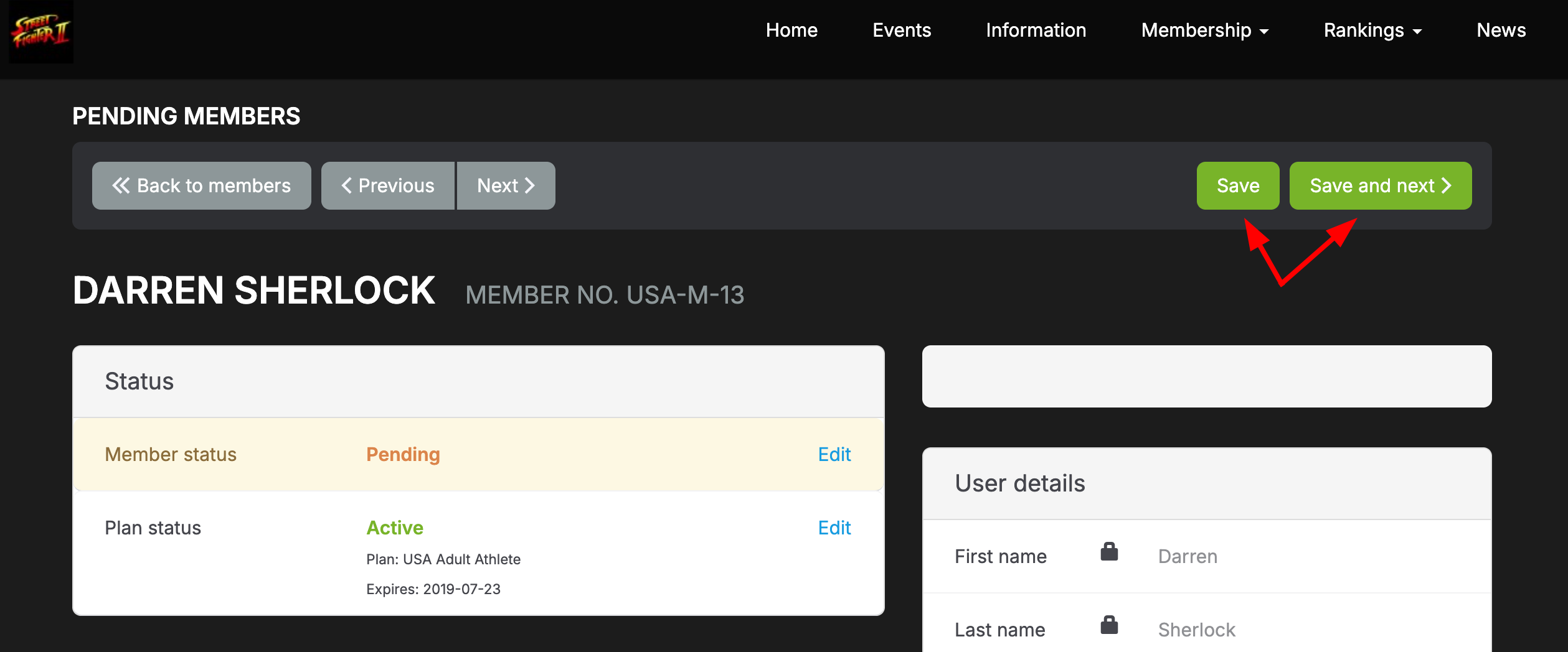 Check all their details and set their membership status. Then either press Save or Save and next, which will take you straight to the next member to review.