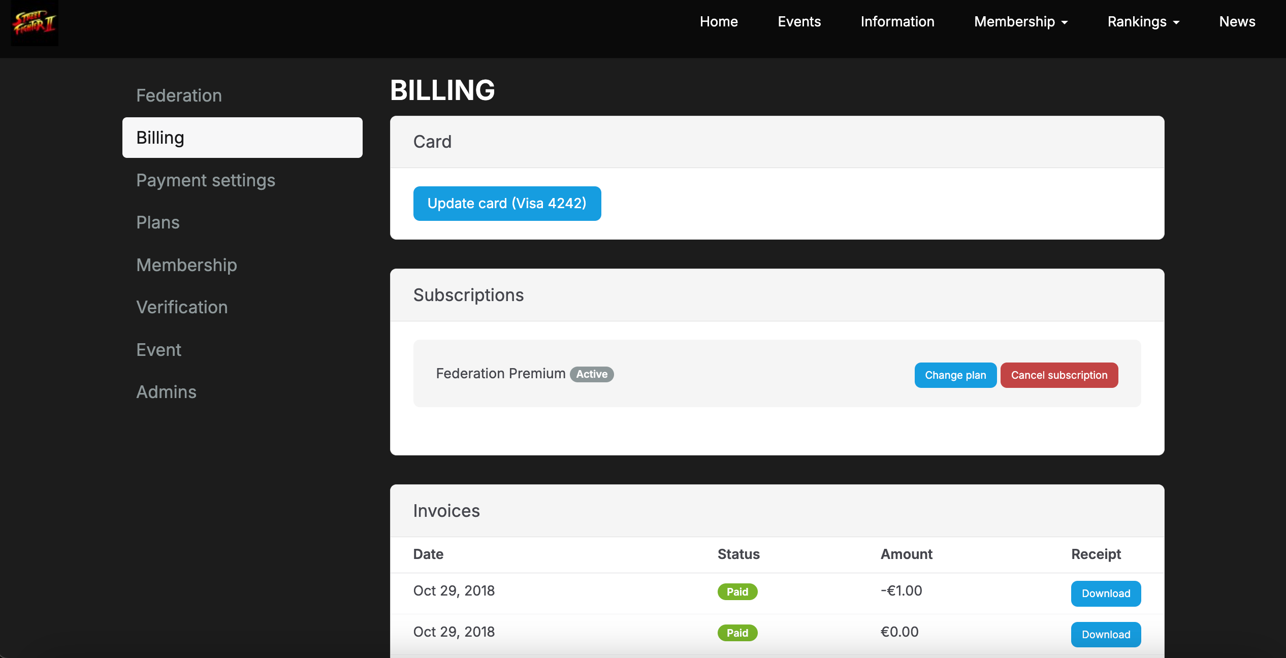 In this section you can see/update the creditcard you have on file for payments of your Federation/Company platform.