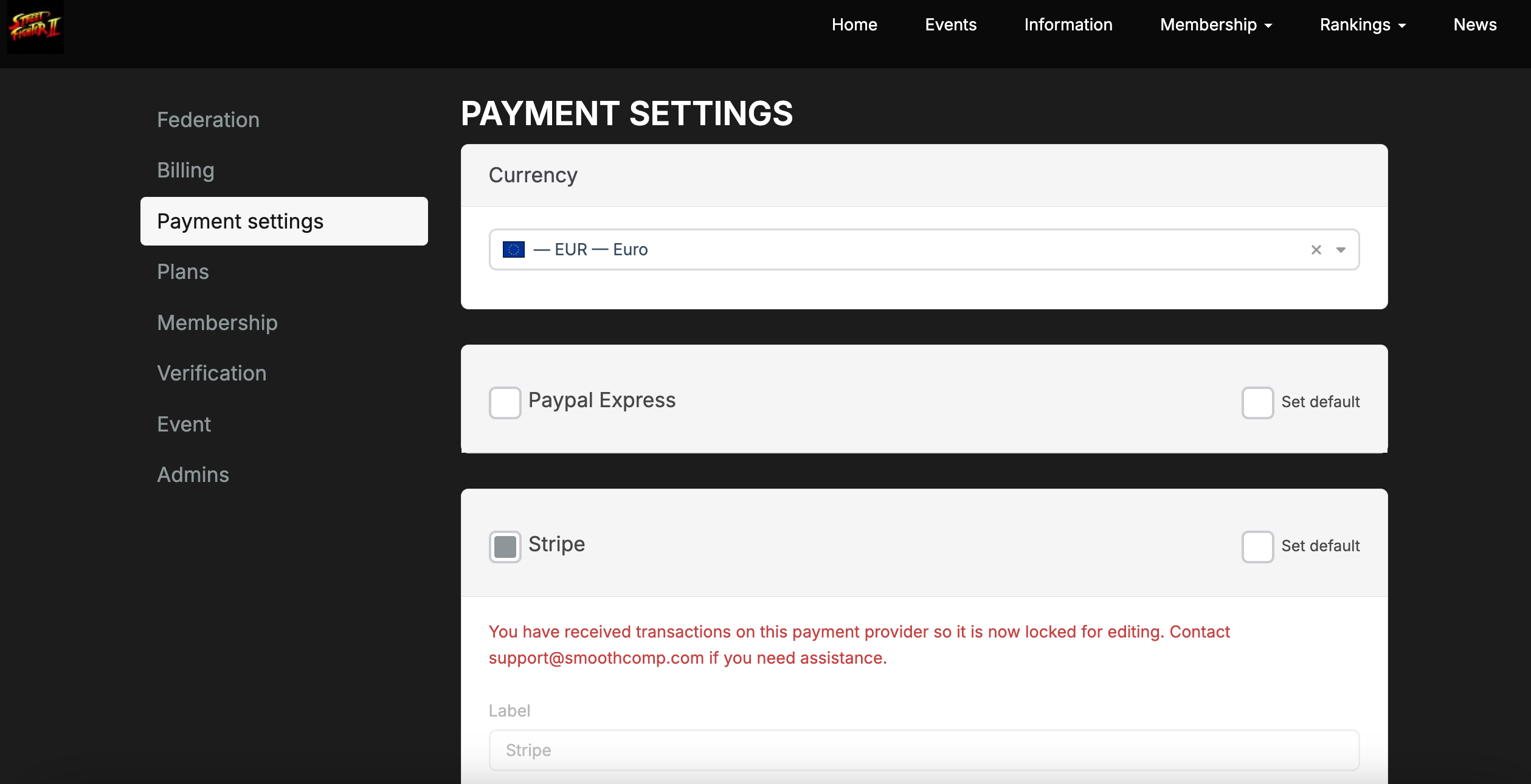 This is where you set the currency for membership plan fees and input your API keys from Stripe, PayPal and/or other online payment solutions that we support and you want to offer your users to pay with. Smoothcomp never charges any fees on the transactions!