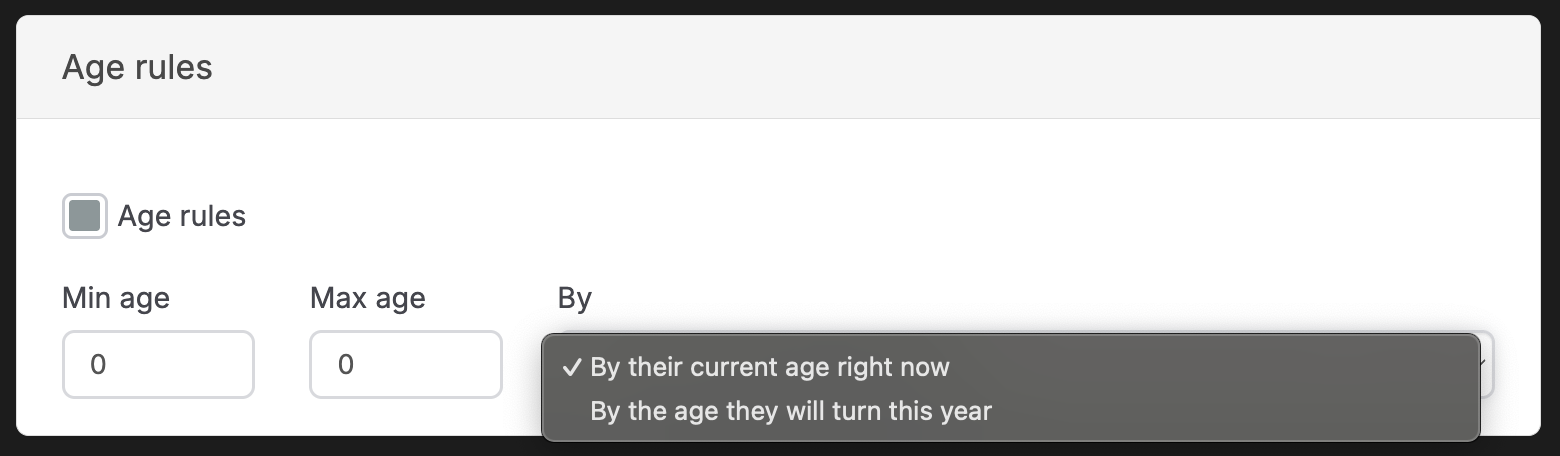 You can also define age rules for who the plan should be available for. Smoothcomp will check the age set on their user profile settings. You can choose age rules based on their current age right now or by the age they will turn this year.