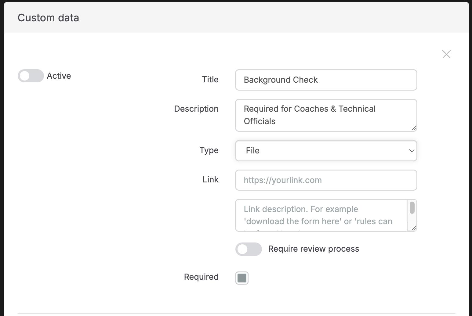 Maybe you want your members to upload a medical certificate or choose a t-shirt size? Build your own custom data and collect to the bank (of data).