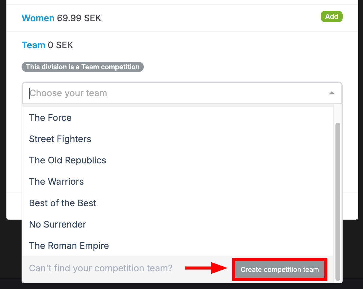 An athlete can then click Create competition team in order to create a new team during the registration process.