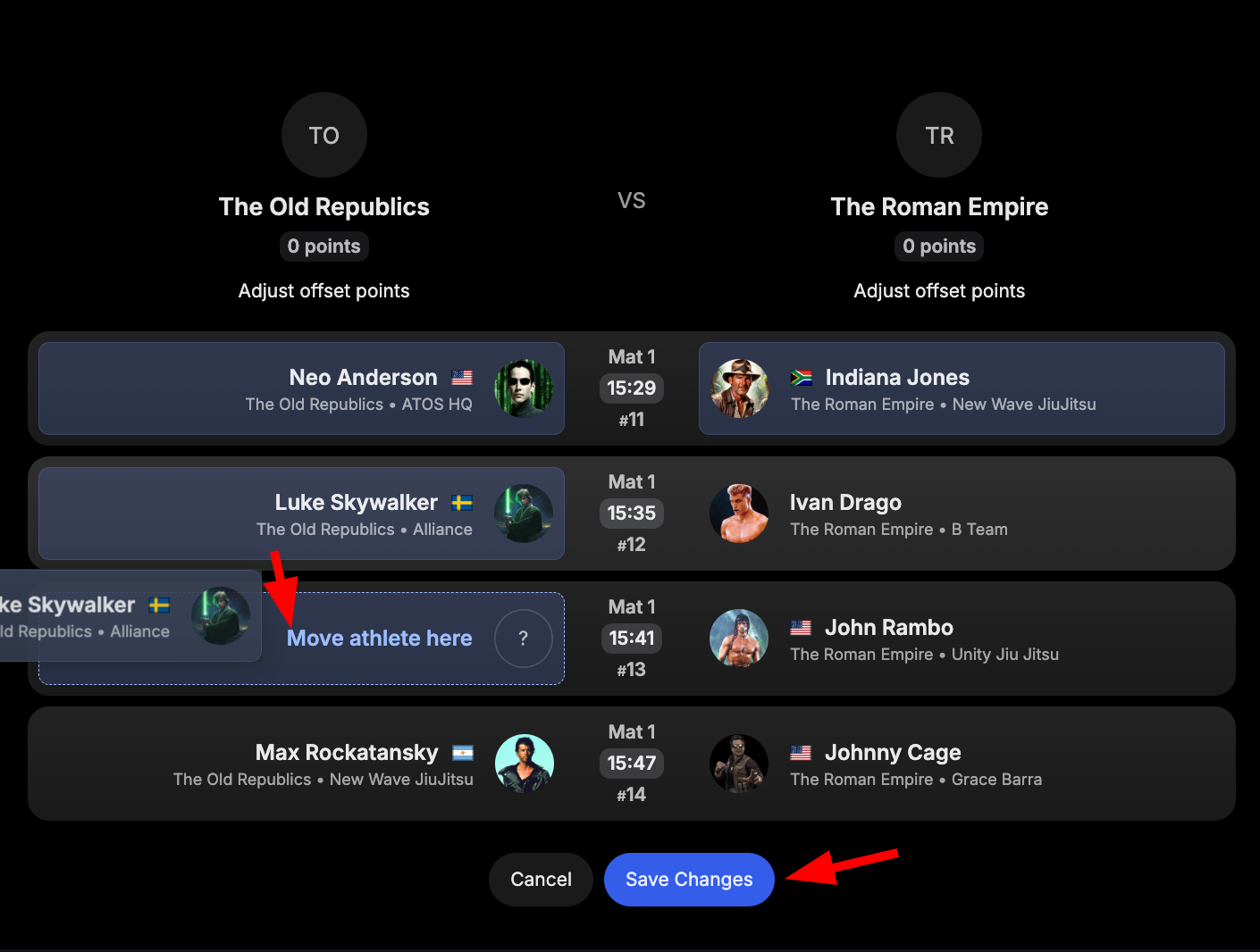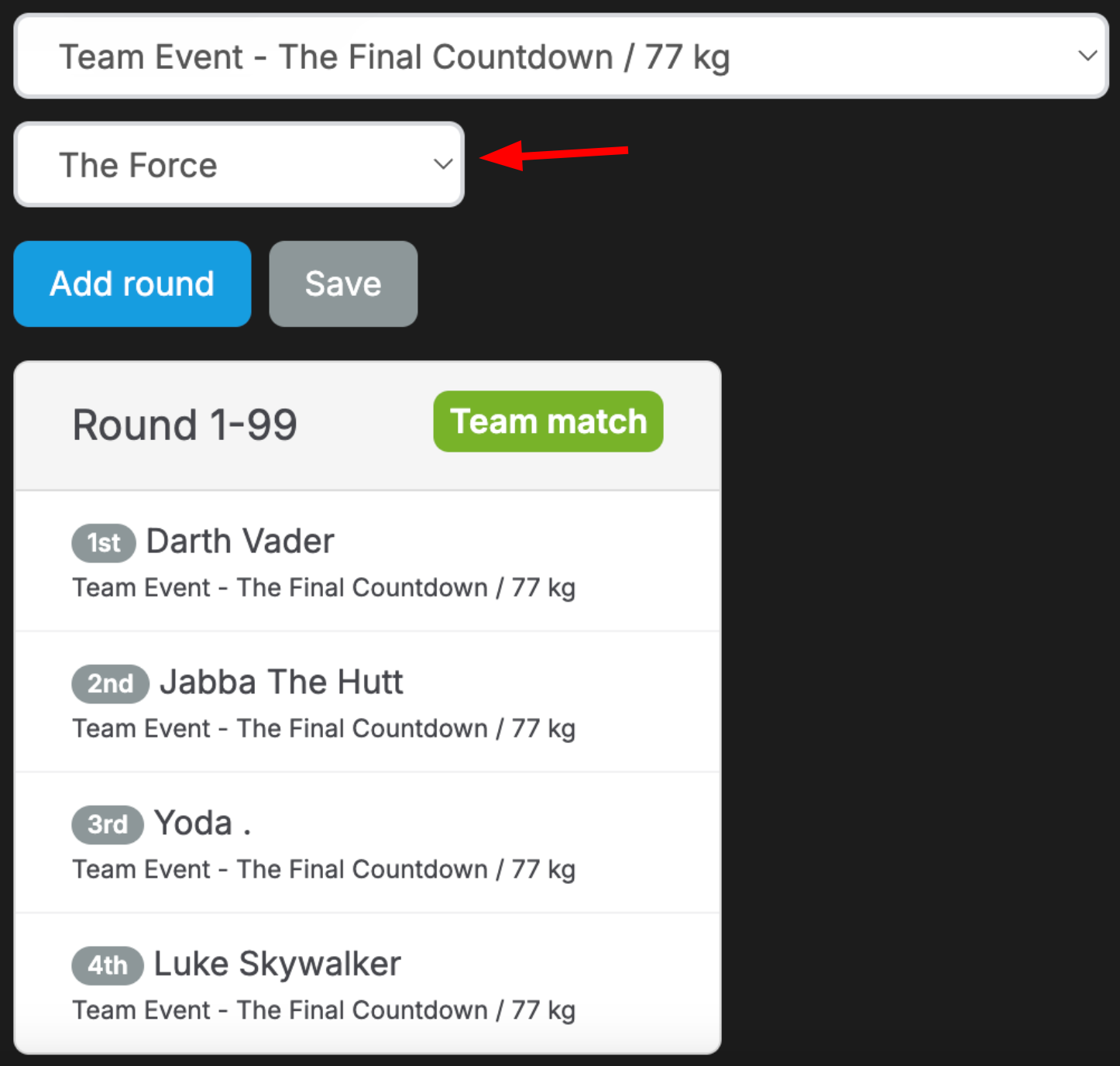 Choose the team you want to work with in the drop down bar and drag the athletes in the order they are set to compete in each round. A "round" can be the quarter finals, semi finals etc and the order is for the team each time they are on the mat.
