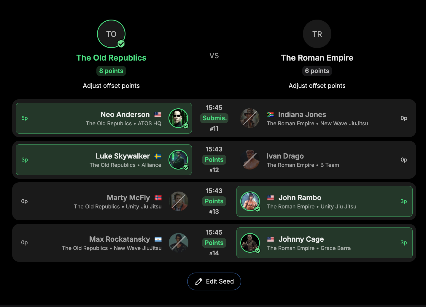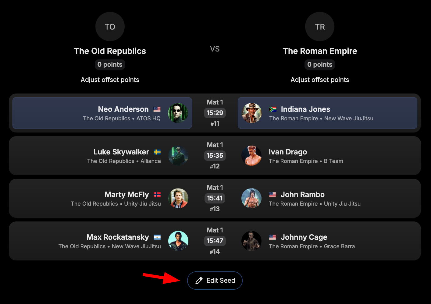 This order can also be changed in the actual team match during the event. Press Edit Seed and drag and drop the athletes to the right order. Don't forget to save the changes!