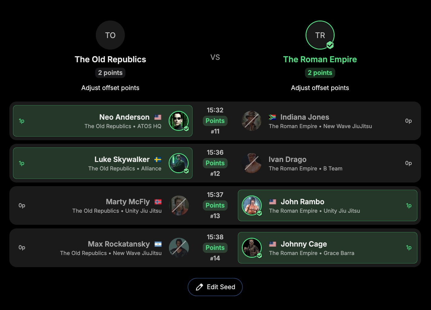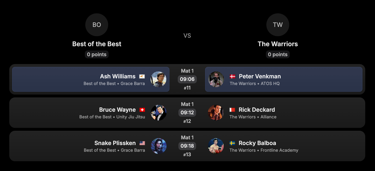 Smoothcomp lets event organizers set up "Team Competitions" and we have support for different variations of a team event. Team Competitions consist of team matches, and within each team match the team members meet each other in one vs. one matches.
