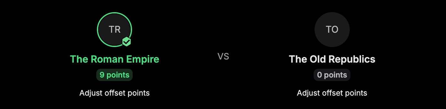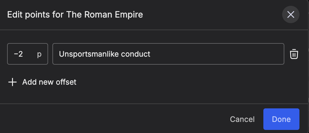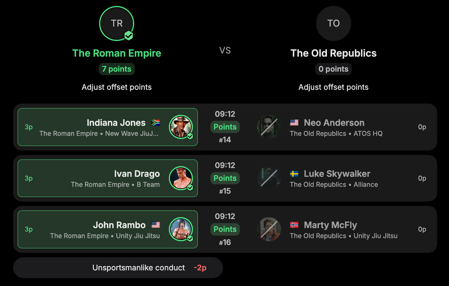 In this example a match has just finished and "The Roman Empire" won all matches, receiving 9 points for the win. However, at the end of the last match an athlete showed unsportsmanlike conduct so the event management decided according to the rules that two points will be deducted (offset) from their score.