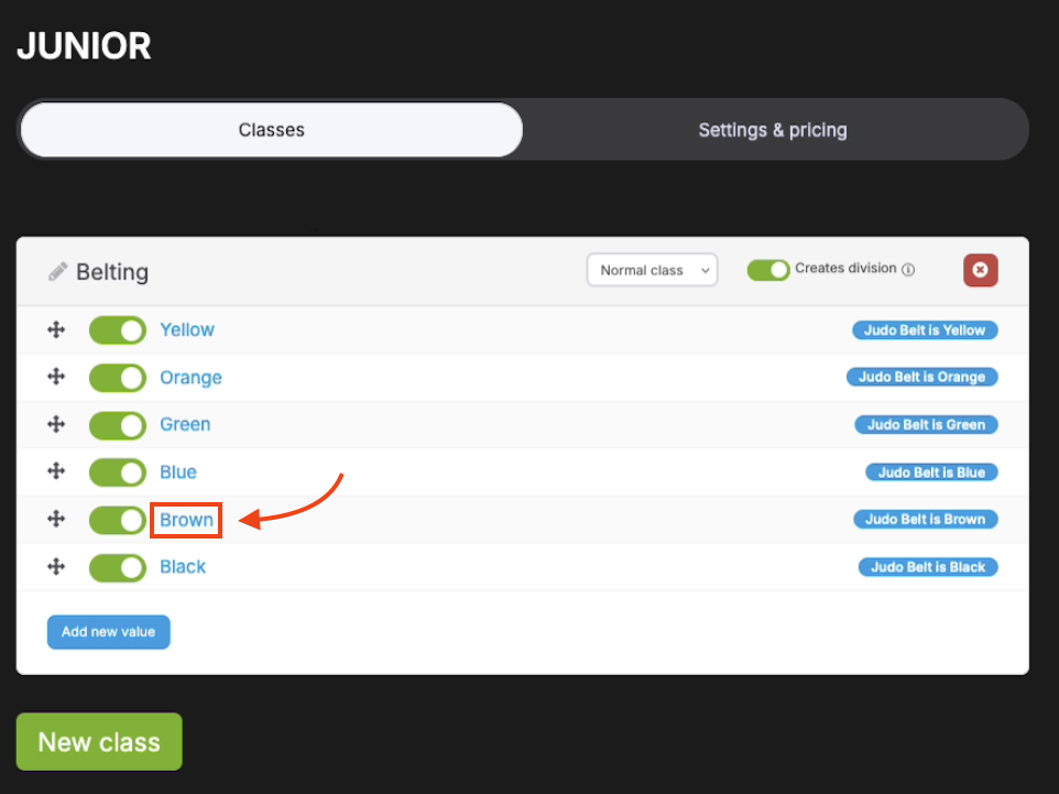For classes with multiple belts allowed (for example a combined brown/black belt class), add them both in the far right skill level selection like you normally would. Note that multiple values selected in the skill level select box will result in OR logic, meaning the athlete can have either a brown or a black belt for example. Adding a new row below with another belt will result in AND logic, meaning the athlete needs to have both belts, which often is not what you are looking for.