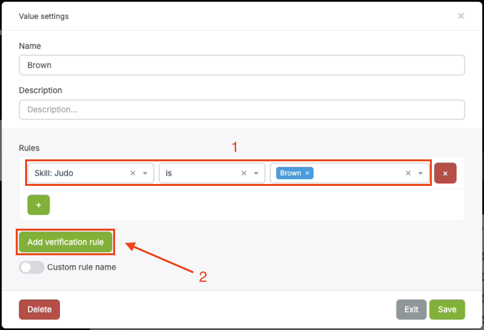 In the dialog opening up, first make sure you have a regular belt rule. As in the 1 marked box below, you need at least one rule following the format of "<skill> is <skill level>". For example, "Skill: Judo is Brown", meaning a brown belt in Judo is required for all athletes registering in this class. You can only require verifications on belts you already require as is, so make sure the correct belt is added here.