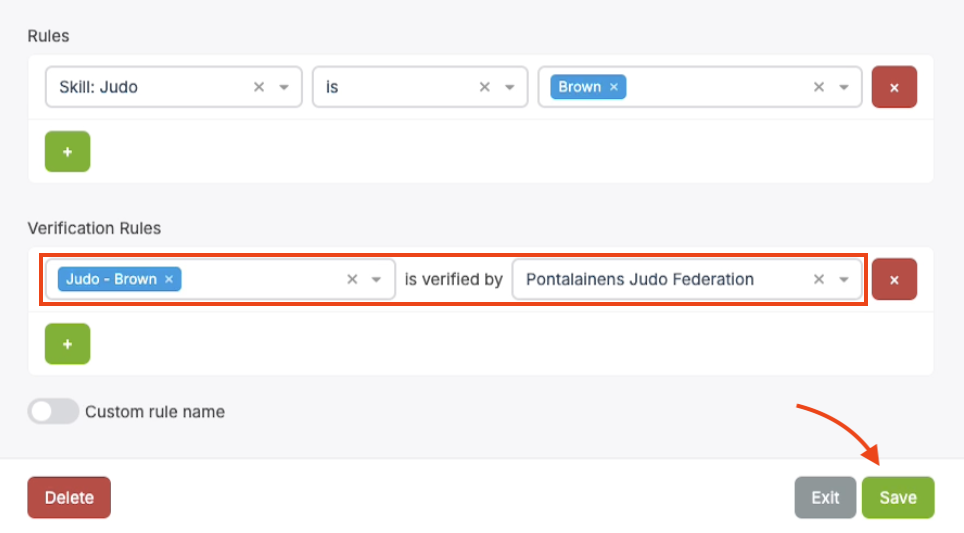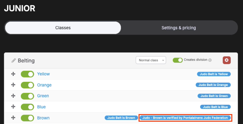 Similar to the rule form above, the skill level input here creates OR logic, and a new row creates AND logic. For example, an input like "Judo - Brown, Judo - Black is verified by Pontalainens Judo Federation" will mean athletes registering need to have their belt (either brown or black) verified by Pontalainens federation. On the contrary, one row of "Judo - Black is verified by Pontalainens Judo Federation" and another row of "Judo - Black is verified by Jansons Judo Federation" will mean that a black belt verification from both Pontalainens and Jansons Judo federations are required.