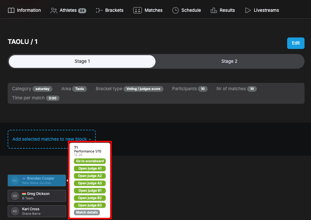 Match info - Short info about the match, bracket and athlete