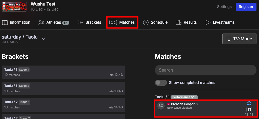 ... or from the Current matches view. Go to Matches - Current matches. Click on View mat to go to the correct mat and click on the match in the matches list: