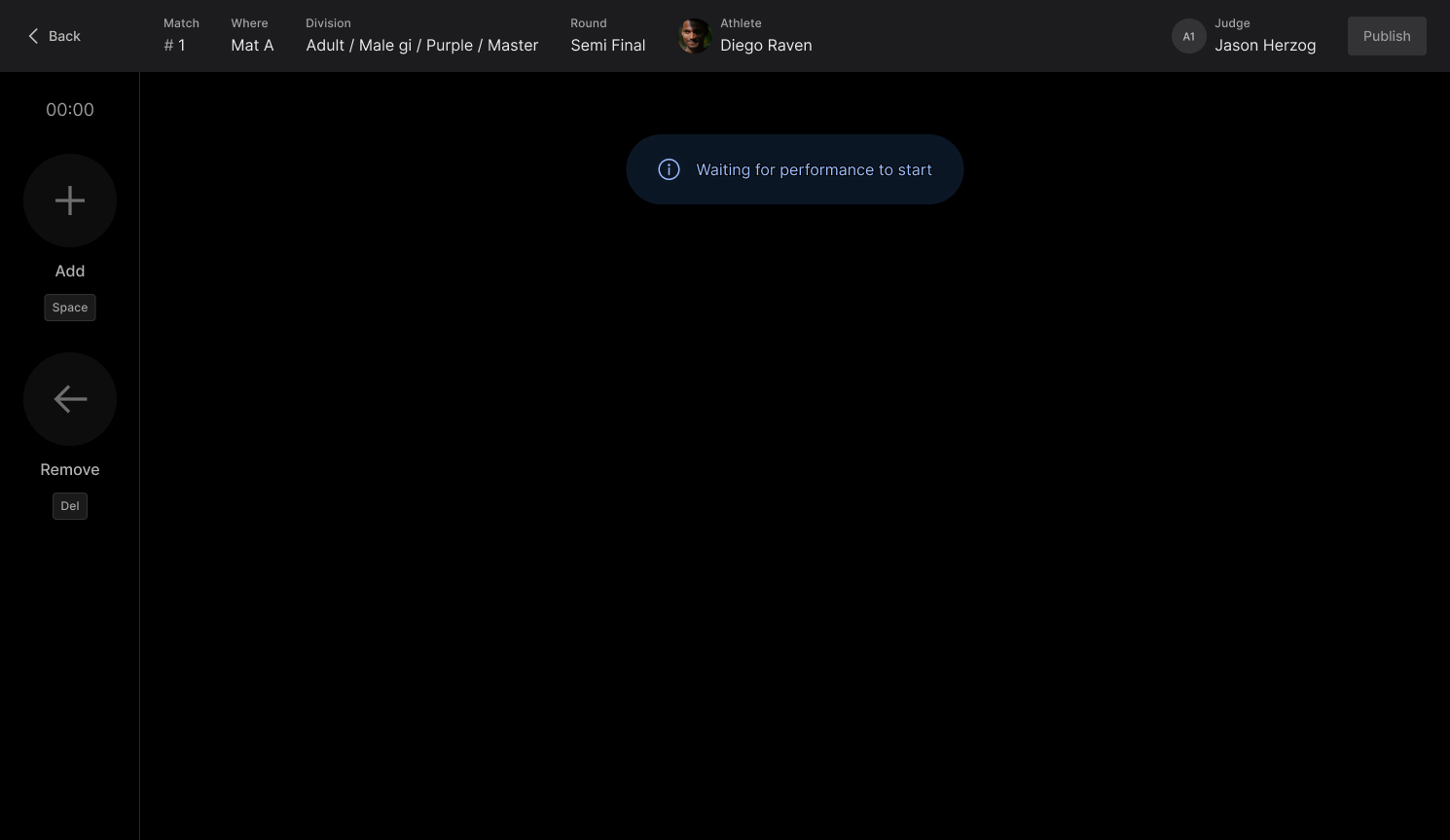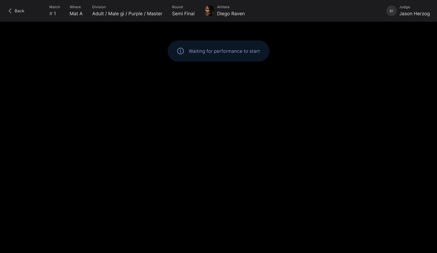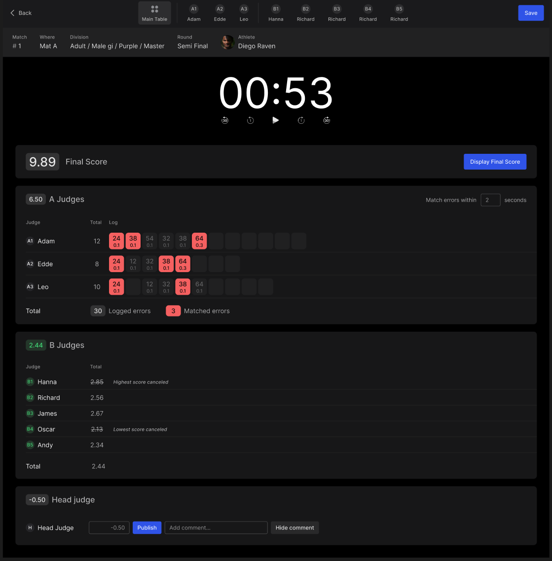 Match clock - Start the clock to begin the match! This will activate the judges’ input devices and allow them to start scoring in real time.