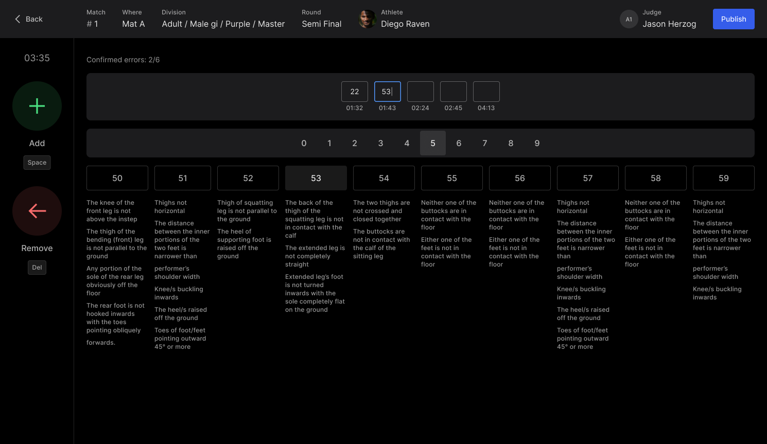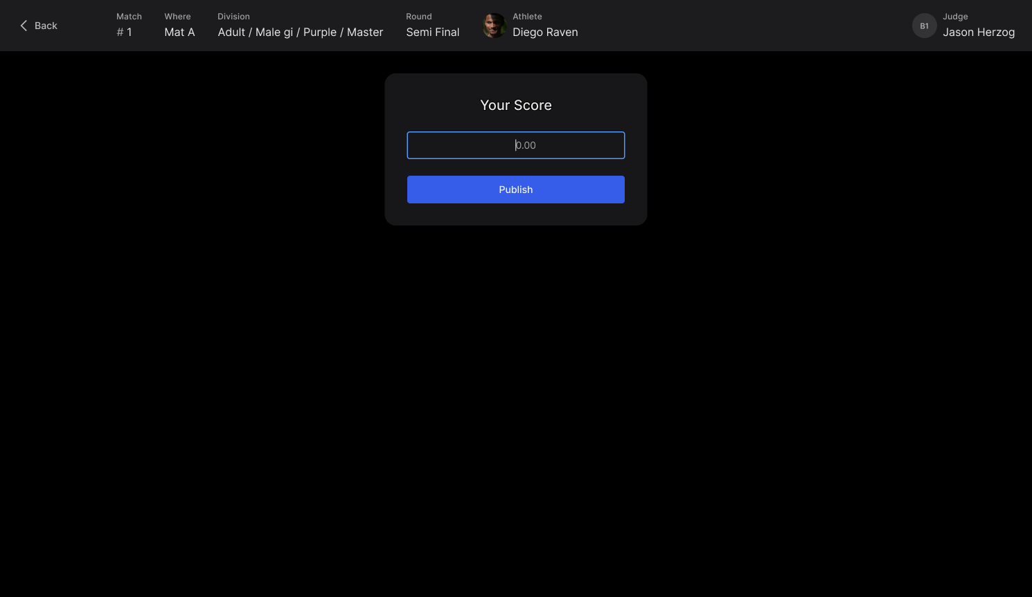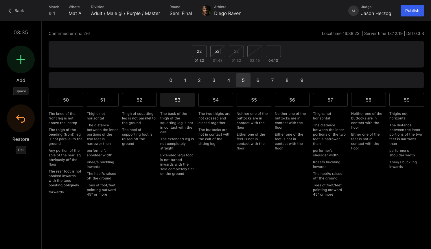 Match clock - Start the clock to begin the match! This will activate the judges’ input devices and allow them to start scoring in real time.