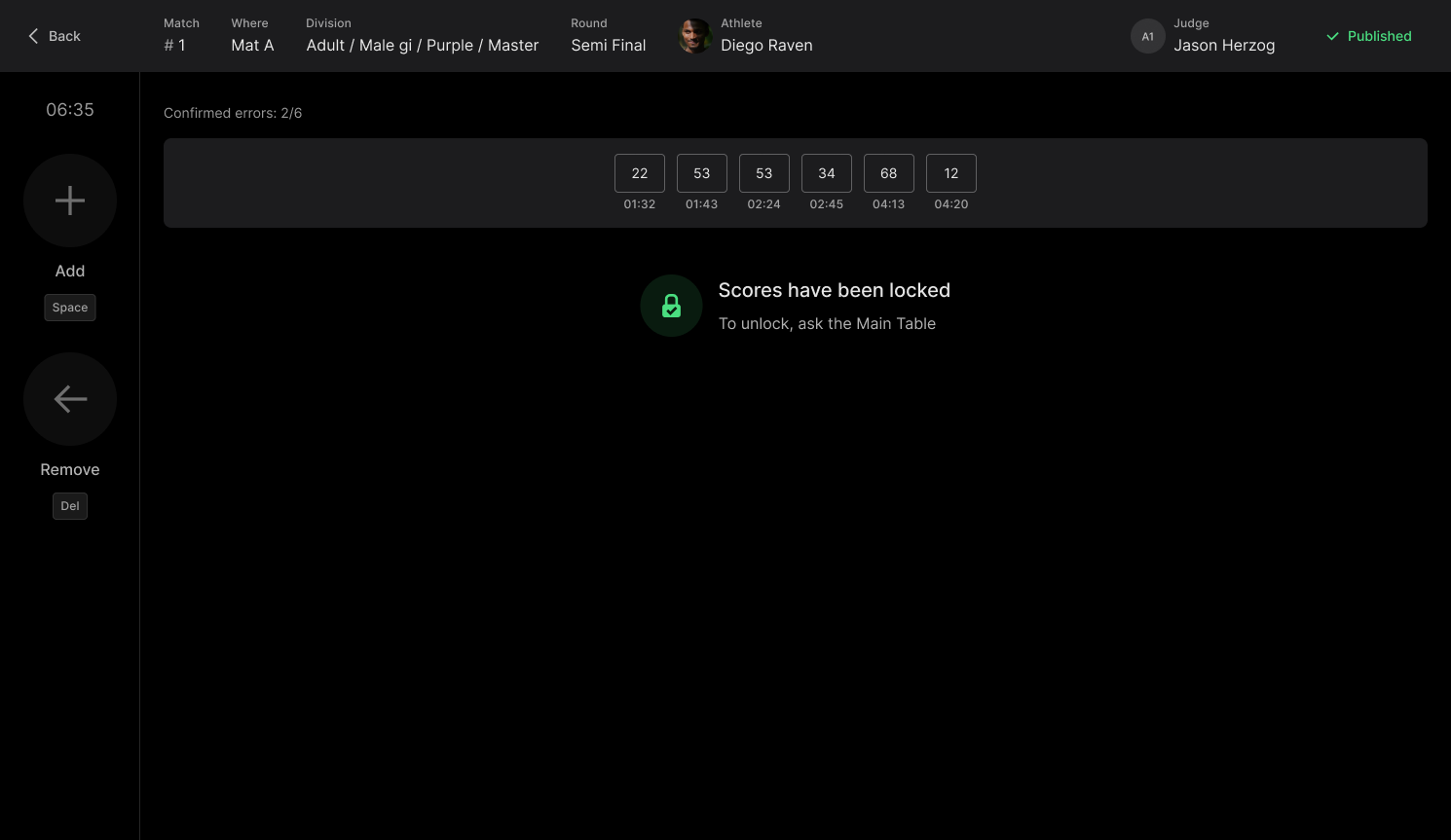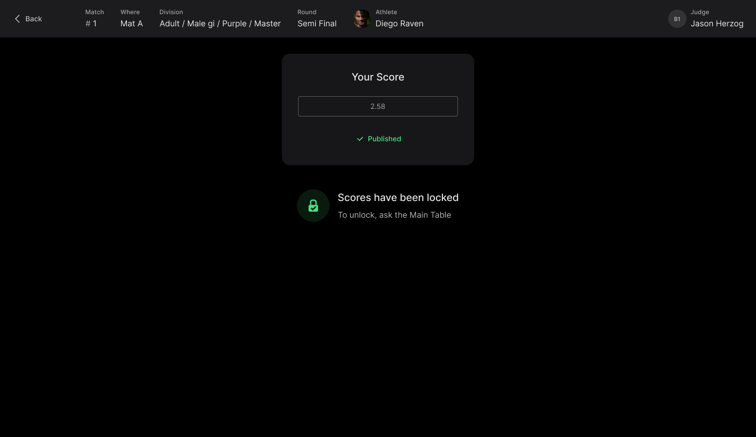 When a judge publishes their score, their icon will turn green. Once all judges have submitted their scores, the total score will also turn green.